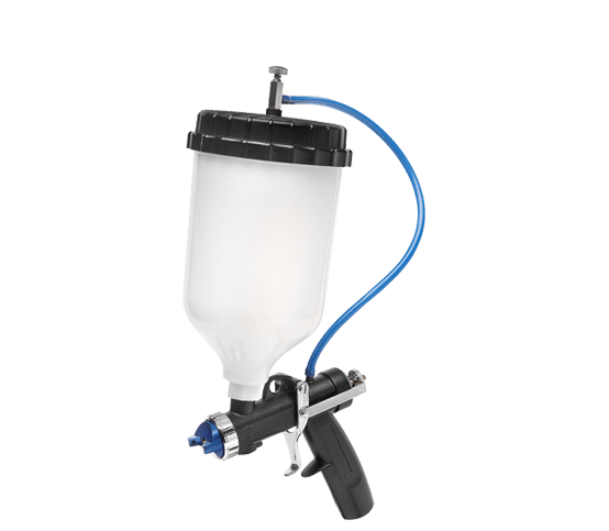 El aerógrafo con depósito superior de plástico por gravedad, que se puede combinar con las turbinas TMR, permite la aplicación por pulverización, mediante el sistema HVLP, de diferentes recubrimientos, pinturas al agua o con base de disolvente, pinturas murales, sobre diferentes sustratos.