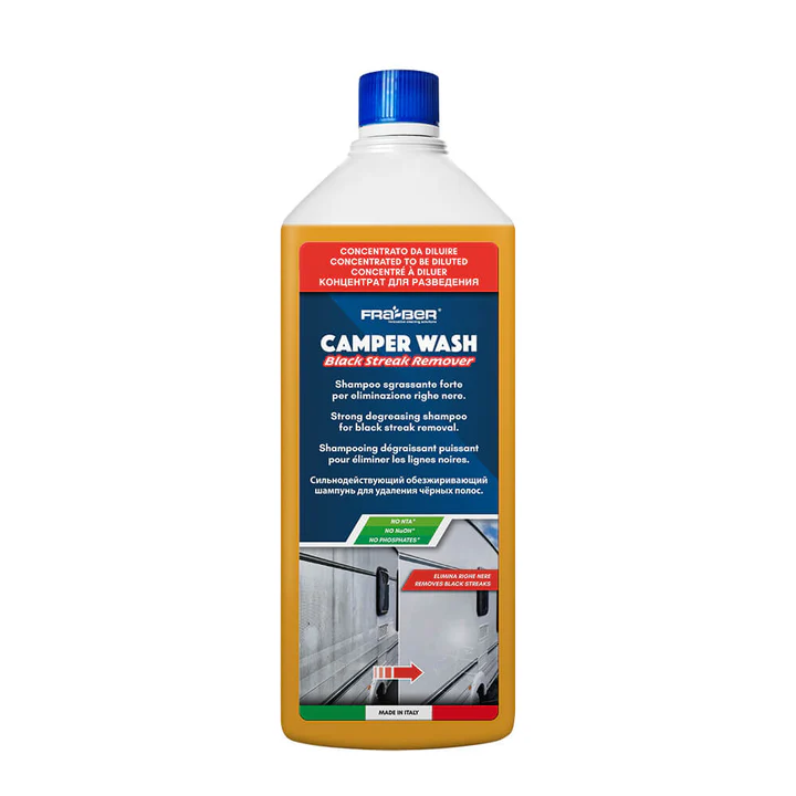 Camper Wash de Fra-Ber es un champú especial diseñado específicamente para limpiar y eliminar de manera eficaz las persistentes rayas negras que suelen aparecer en este tipo de vehículos.