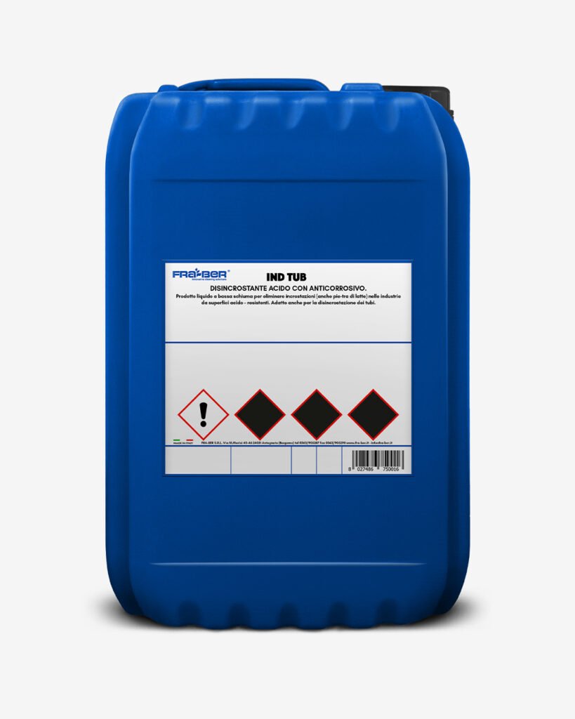 Ind Tub es un producto líquido de baja espuma para eliminar incrustaciones (incluida la cal de leche) de superficies industriales resistentes al ácido. También es adecuado para desincrustar tuberías.
