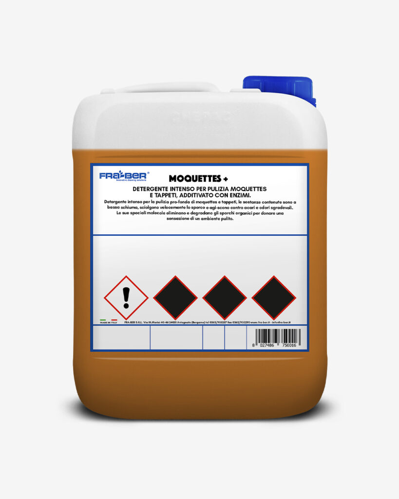 Moquettes + es un limpiador intensivo para la limpieza profunda de alfombras y tapetes. Su fórmula de baja espuma elimina y desatasca eficazmente la suciedad orgánica, mientras que sus moléculas especiales combaten los ácaros del polvo y los malos olores*, dejando un ambiente limpio y fresco.