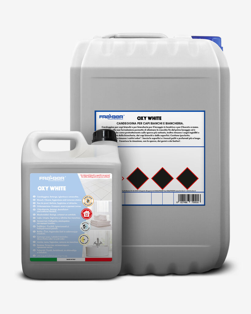 Oxy White devuelve a las prendas su blancura extrema, eliminando eficazmente el amarilleo, las manchas de color, las manchas de humedad y los malos olores** de todos los tejidos blancos resistentes a la lejía (como manteles, batas, mantelería, etc.). También ayuda a eliminar gérmenes y bacterias*, además de la suciedad.