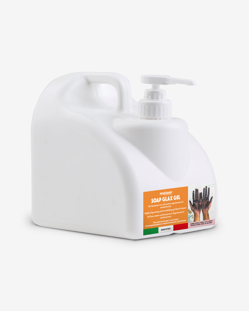Soap Glax Gel es un gel de manos enriquecido con sericina para eliminar aceite, grasa, pegamento, silicona, resinas, lubricantes, hidrocarburos, betún, óxido, grafito y suciedad incrustada. Limpia en profundidad pero con suavidad, dejando las manos suaves y protegidas. Envase de 3 L con dosificador incluido.