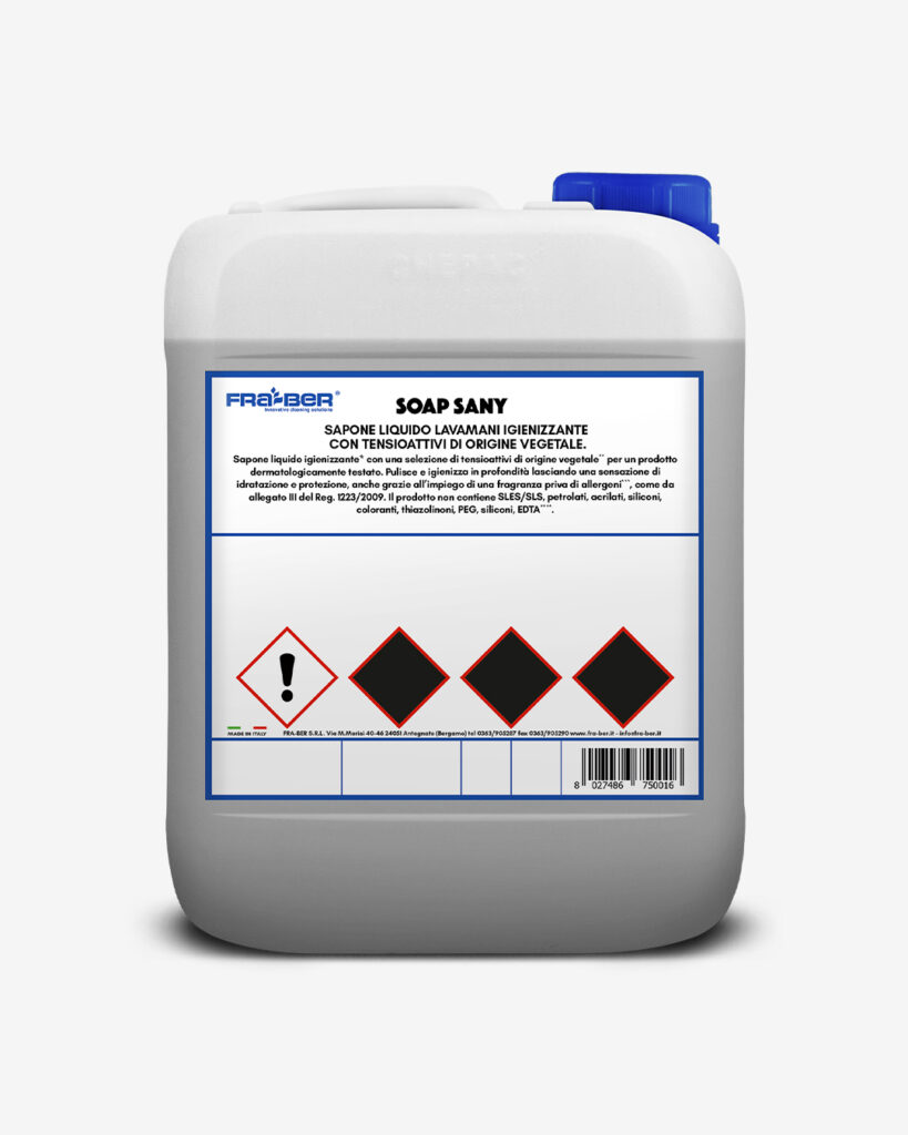 Soap Sany es un jabón líquido higienizante con una selección de tensioactivos vegetales** para un producto dermatológicamente testado. Limpia e higieniza en profundidad, dejando una sensación de hidratación y protección gracias a su fragancia sin alérgenos***, según el anexo III del Reglamento 1223/2009.