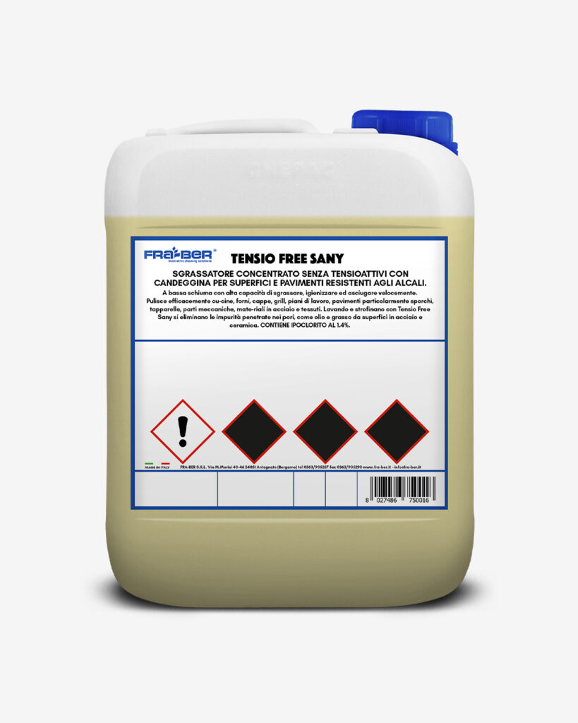 Tensio Free Sany es un producto de baja espuma que ofrece un potente desengrasado, una eficaz higienización* y un secado rápido. Limpia eficazmente cocinas, hornos, campanas extractoras, parrillas, encimeras, suelos muy sucios, persianas, piezas mecánicas, materiales de acero y tejidos. Lavar y fregar con Tensio Free Sany elimina eficazmente impurezas como aceite y grasa, incrustadas en los poros de las superficies de acero y cerámica.