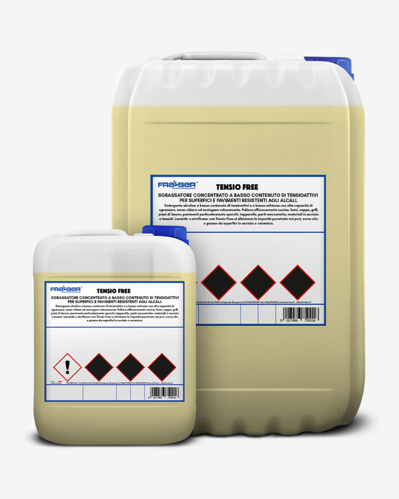 Desengrasante concentrado bajo en tensioactivos para superficies y suelos resistentes a los álcalis. Tensio Free es un limpiador alcalino de baja espuma y bajo en tensioactivos que ofrece un potente desengrasado, una eliminación eficaz de manchas y un secado rápido. Limpia eficazmente cocinas, hornos, campanas extractoras, parrillas, encimeras, suelos muy sucios, persianas, piezas mecánicas, materiales de acero y tejidos. Lavar y fregar con Tensio Free elimina eficazmente impurezas como aceite y grasa, incrustadas en los poros de las superficies de acero y cerámica.