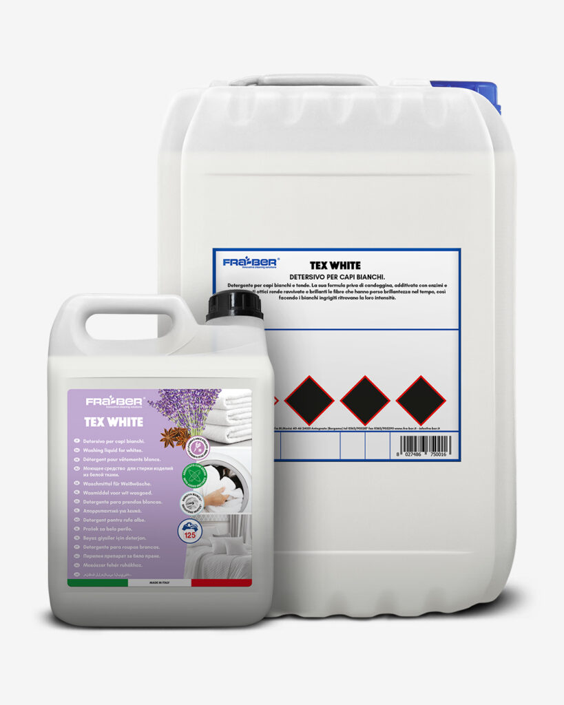 Tex White es un detergente especial para ropa blanca, formulado con enzimas y blanqueadores ópticos sin lejía: abrillanta las fibras que han perdido su brillo con el tiempo, devolviendo la blancura a los tejidos agrisados.