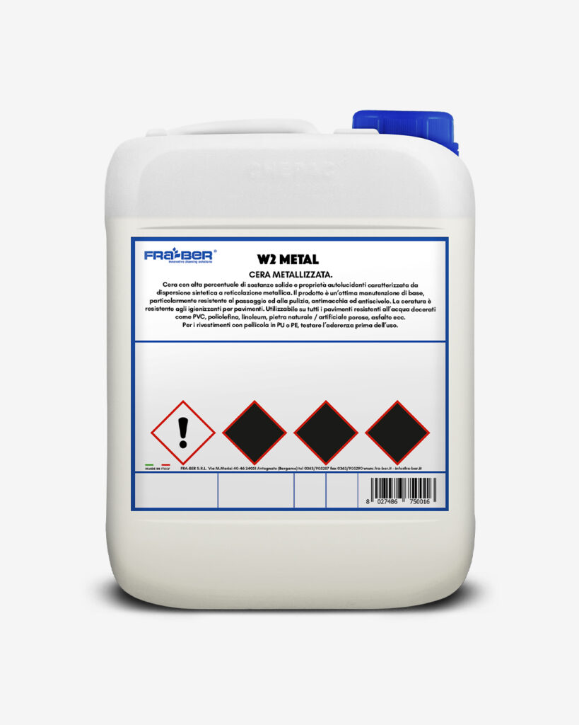 W2 Metal es una cera con alto contenido de sólidos y propiedades autopulimentantes, caracterizada por su dispersión sintética con reticulación metálica. El producto es ideal para el mantenimiento básico, es especialmente resistente al desgaste y a la limpieza, antimanchas y antideslizante. El tratamiento de cera es resistente a los productos de limpieza para suelos. Se puede aplicar a todo tipo de revestimientos de suelo resistentes al agua y decapados de cera, incluyendo PVC, poliolefina, linóleo, piedra natural o artificial porosa, asfalto, etc. Sin embargo, para superficies recubiertas con película de PU o PE, se recomienda realizar una prueba de adherencia antes de su uso.