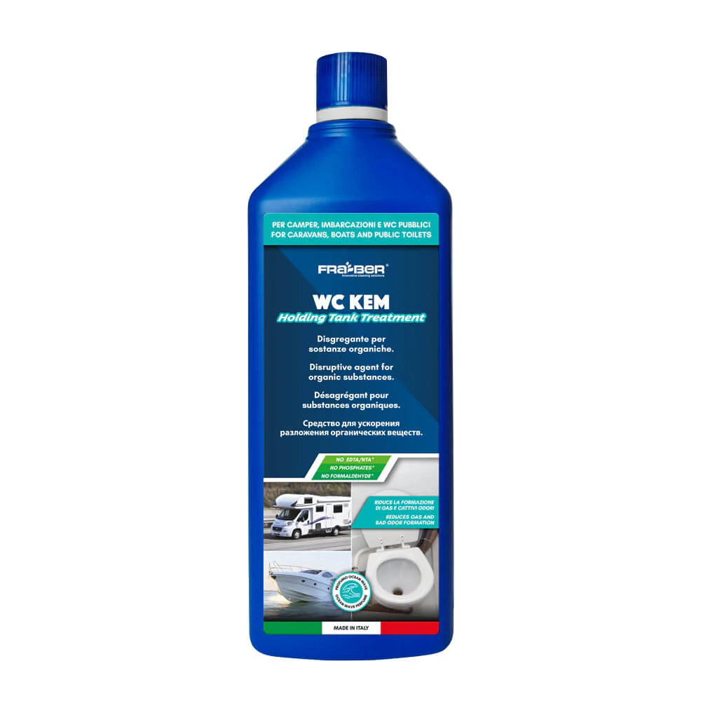 WC Kem de Fra-Ber es un agente desintegrador para baños portátiles, campers y embarcaciones, con una fórmula concentrada y fragante.